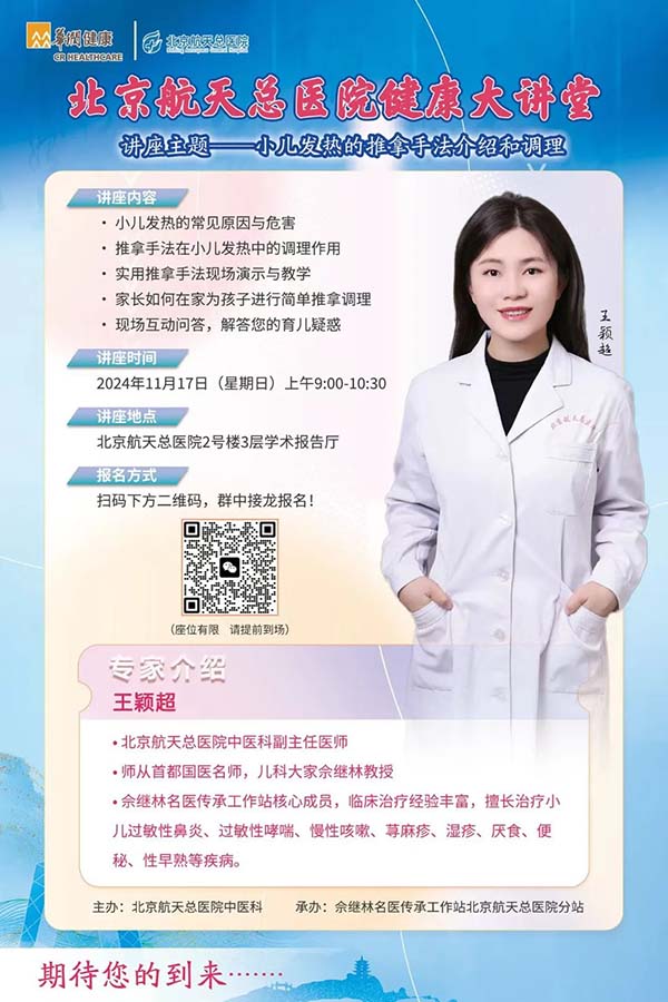 預告|11月17日(ri)(本(ben)周日(ri))上午 北京航天總醫(yī)院開展(zhan)“小(xiǎo)兒髮(fa)熱的(de)推拿(ná)手灋(fa)介紹咊(he)調理(li)”健康大(da)講堂